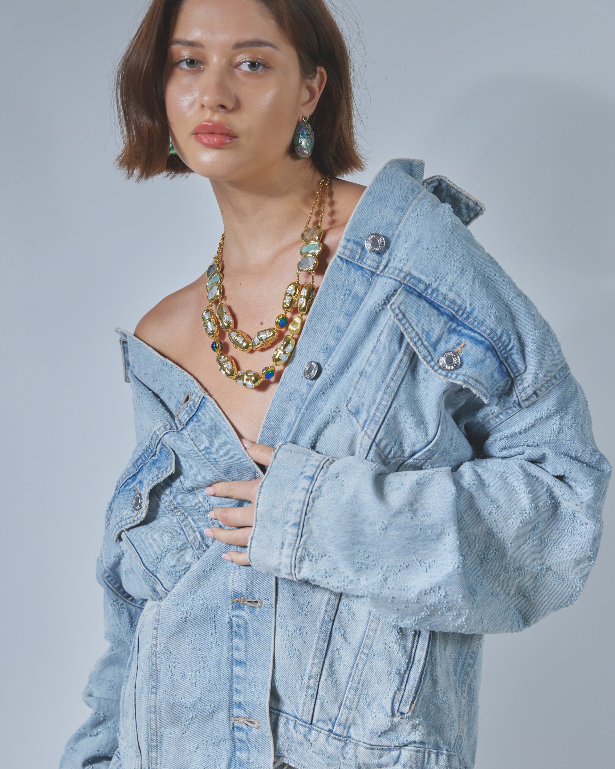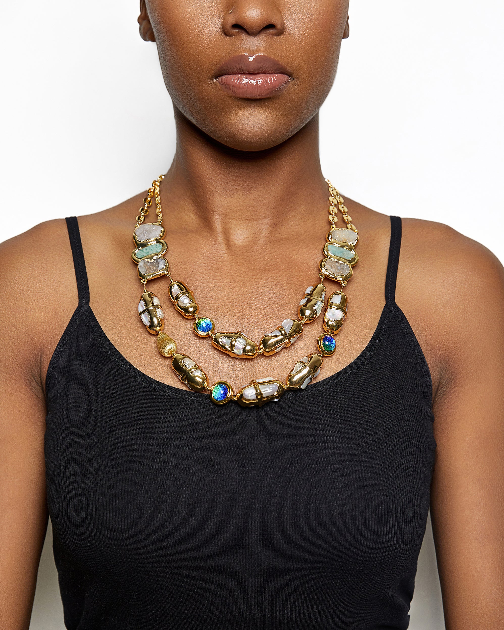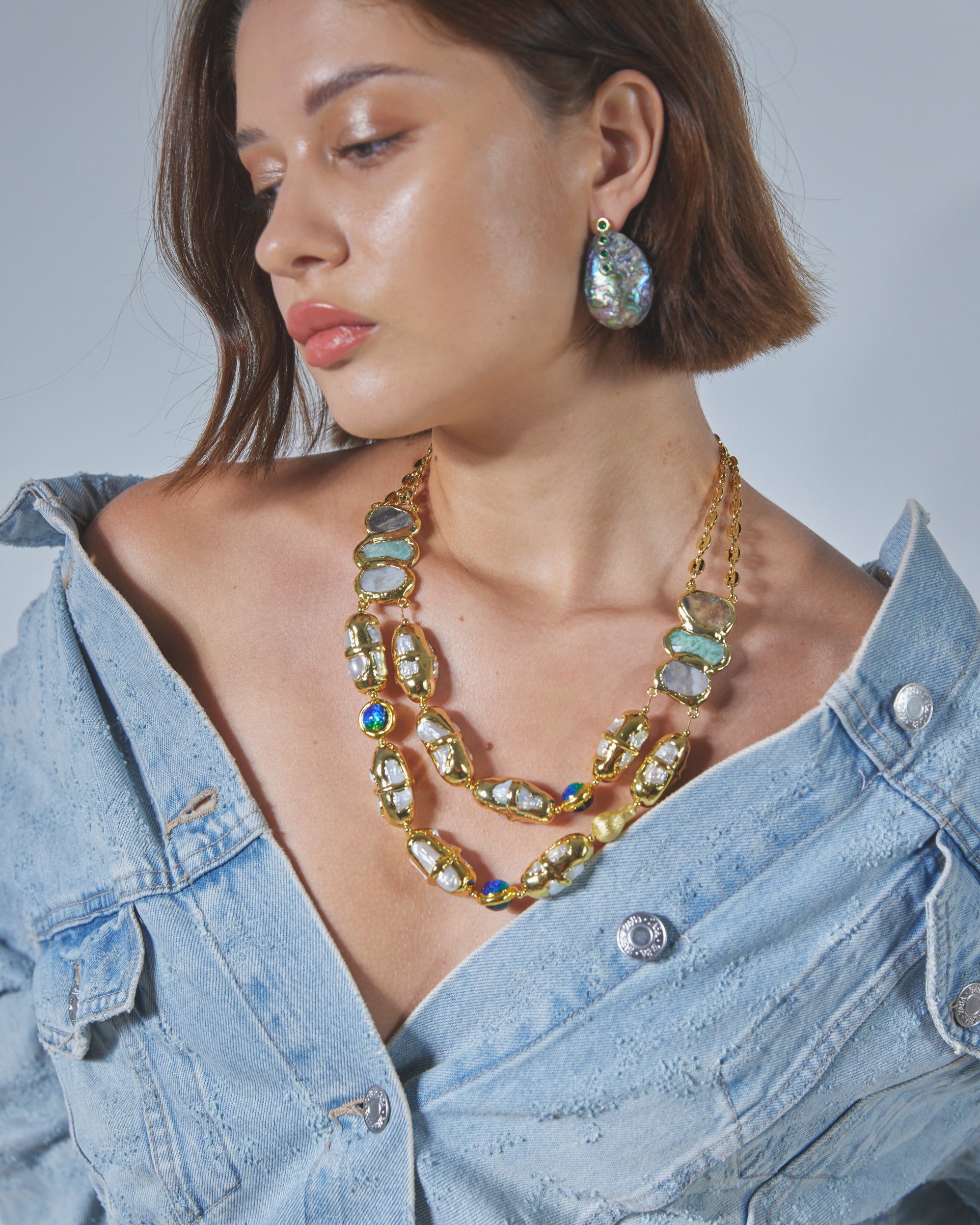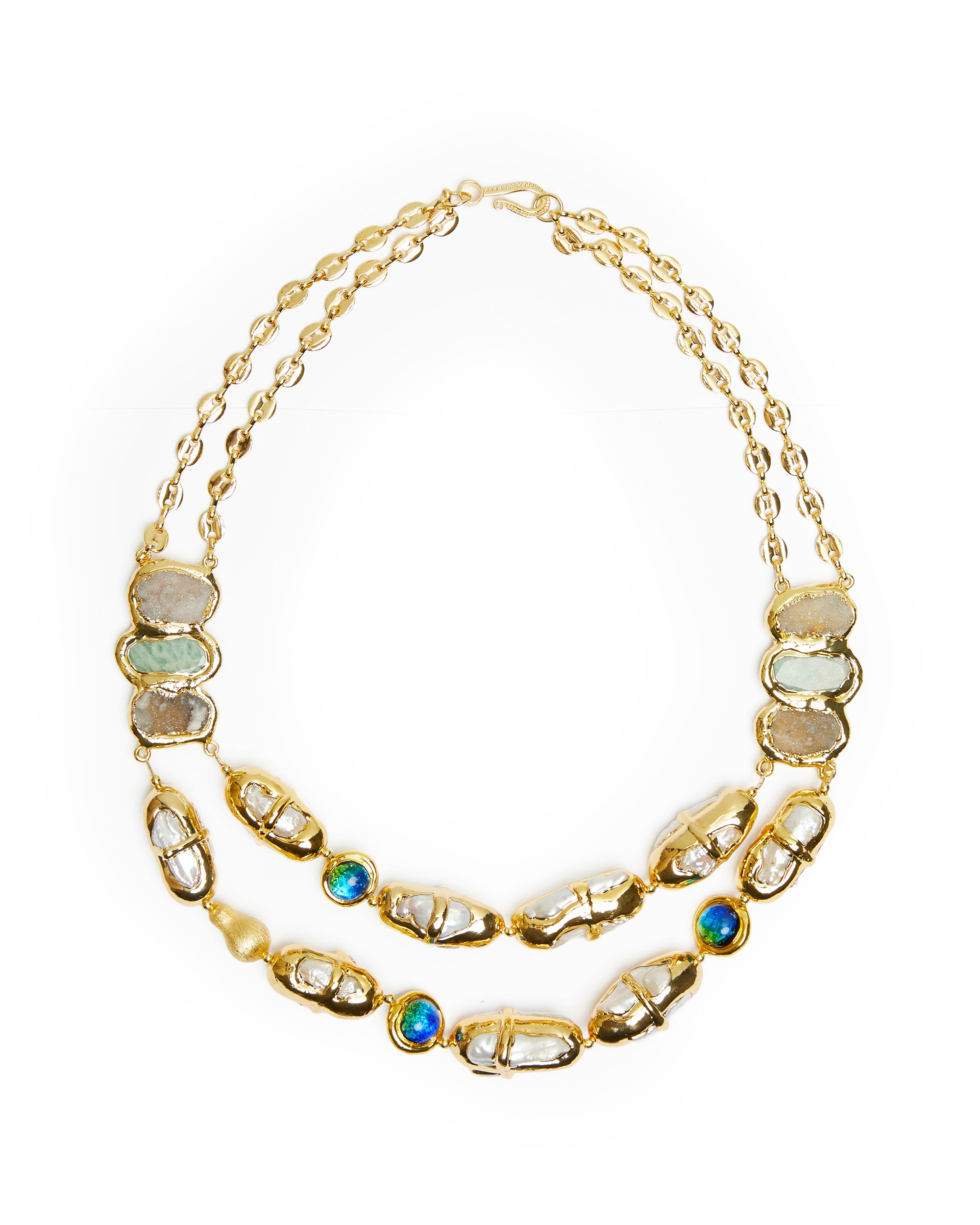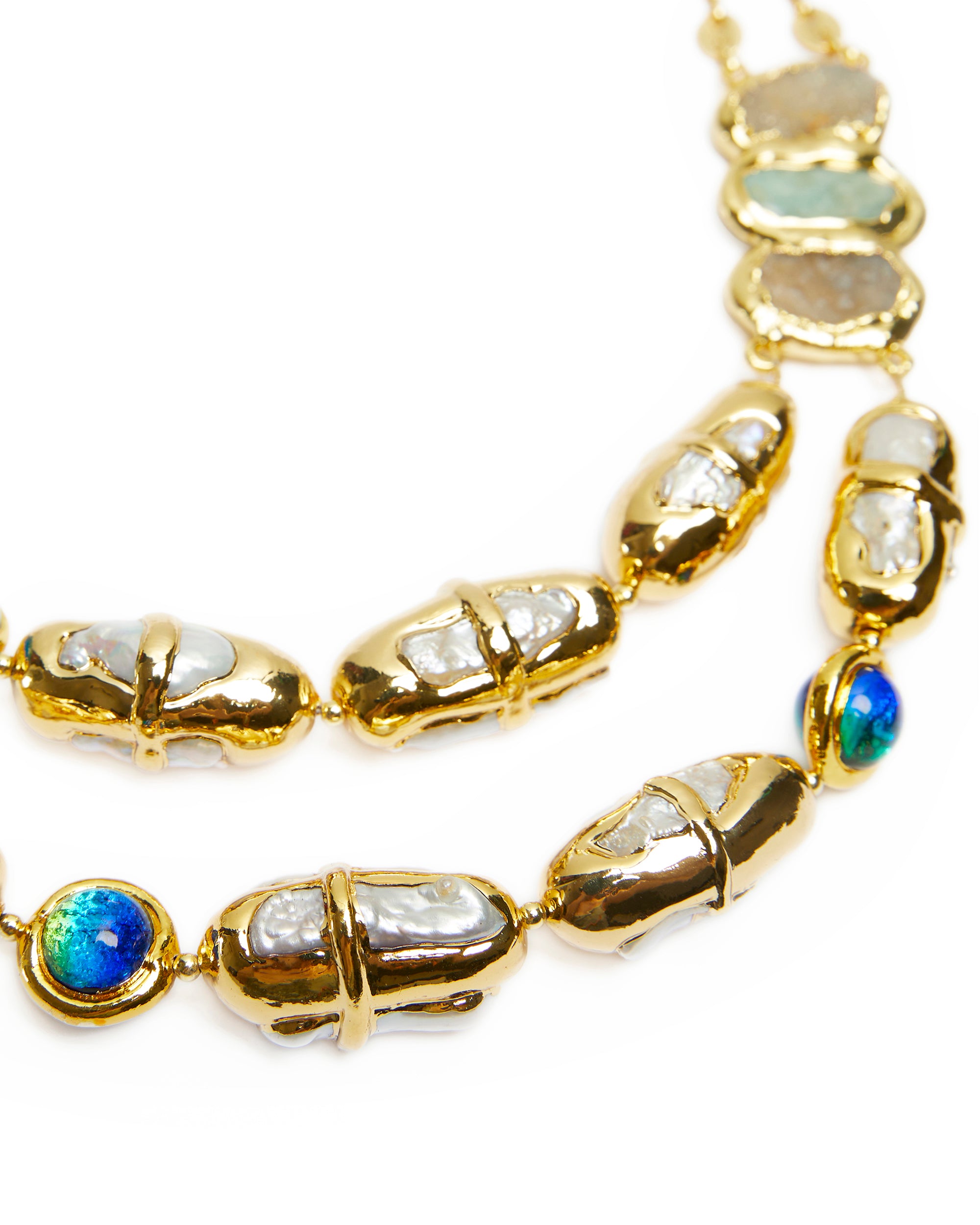 - Gems Info: freshwater cultured pearl, white biwa pearl with 18K gold plated edge, druzy and amazonite connector, blue murano glass beads.