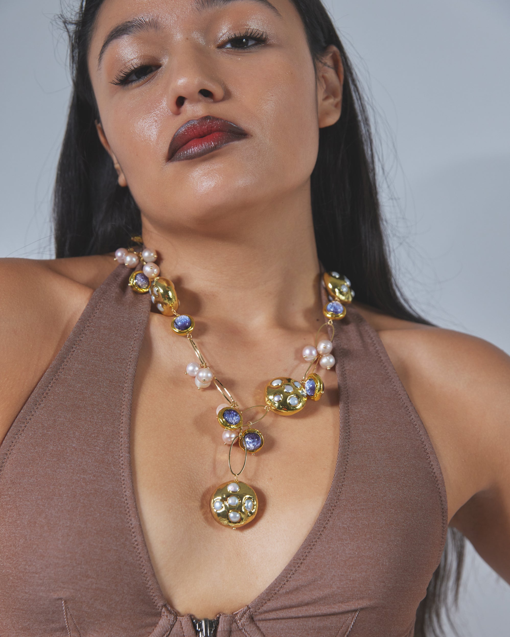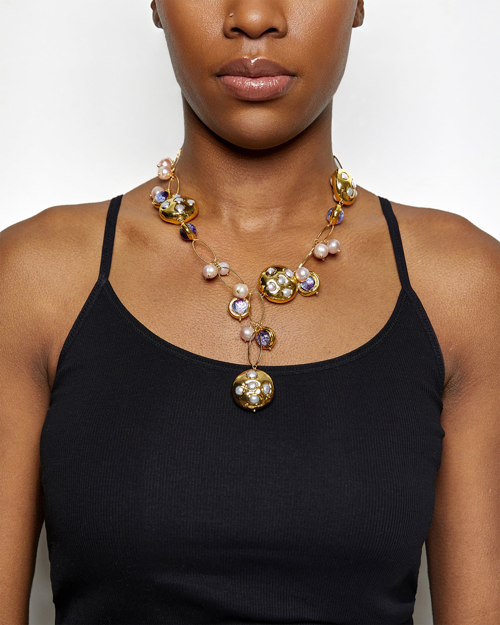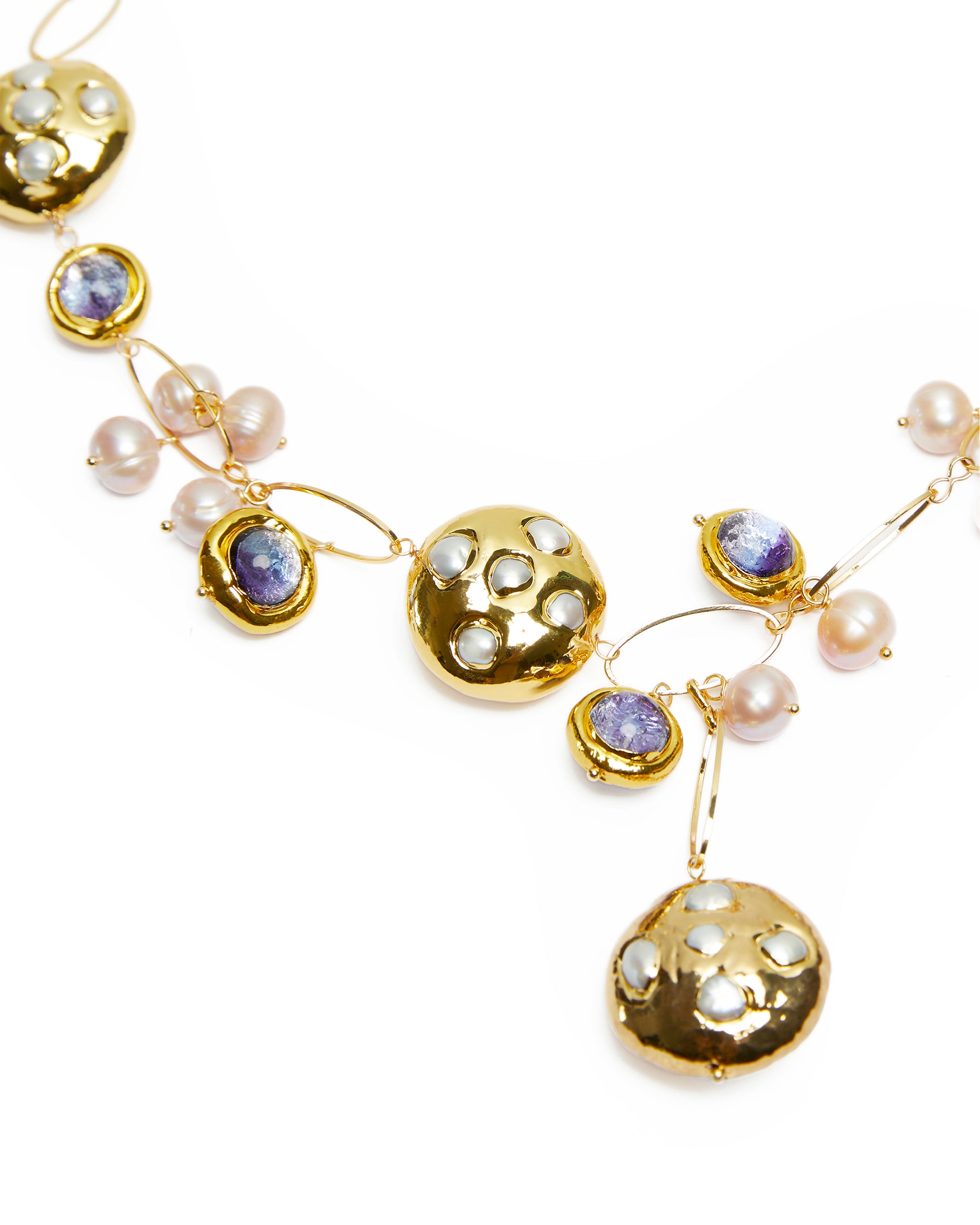 - Gems Info: freshwater cultured pearl, white keshi pearl, pink potato pearl , purple murano glass beads, all with 18K gold plated edges.