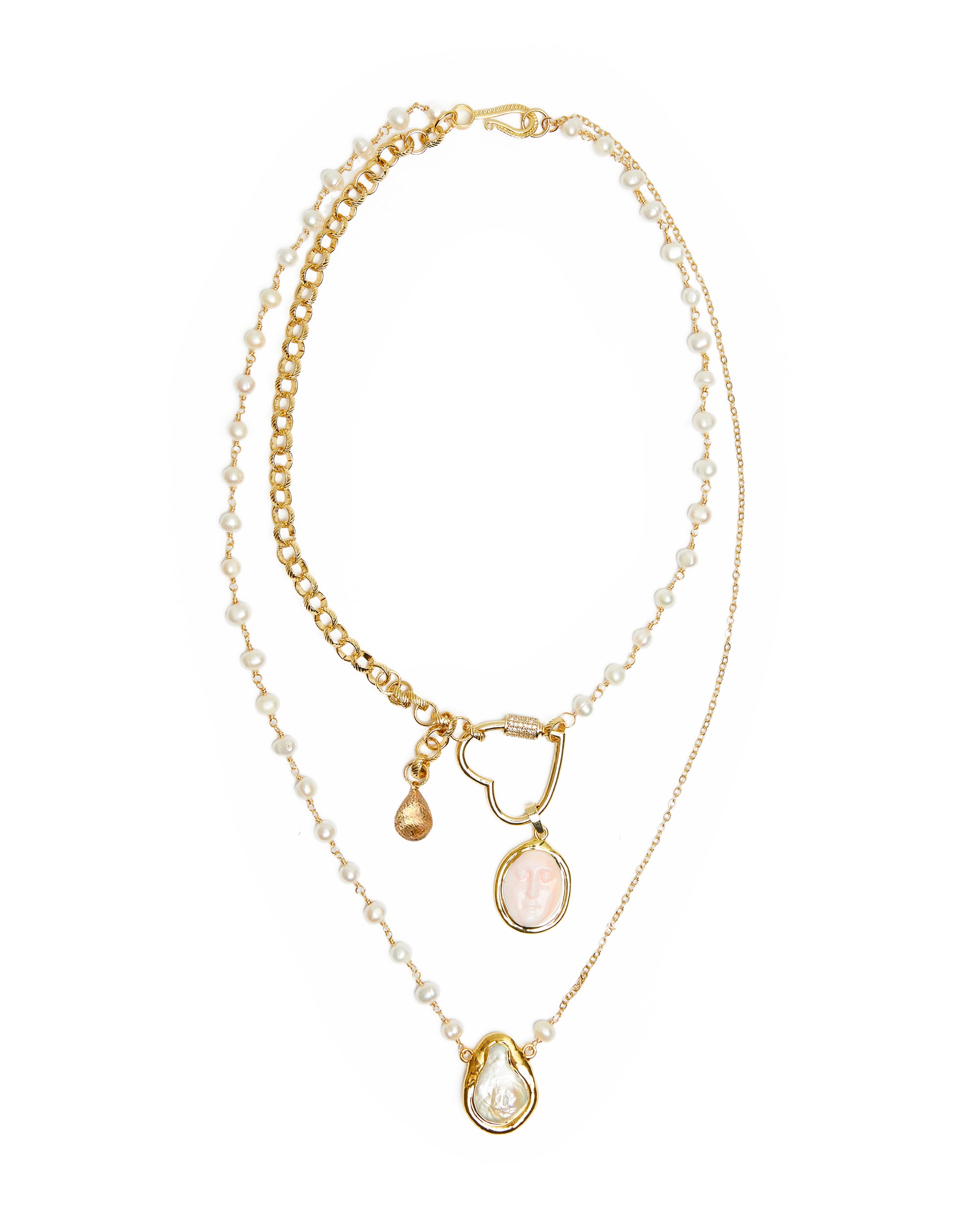 Gems Info:  fresh water cultured pearl, white baroque pearl and potato pearl, natural pink Queen conch facial charm, white coin pearl charm, all with 18K gold plated edges.
