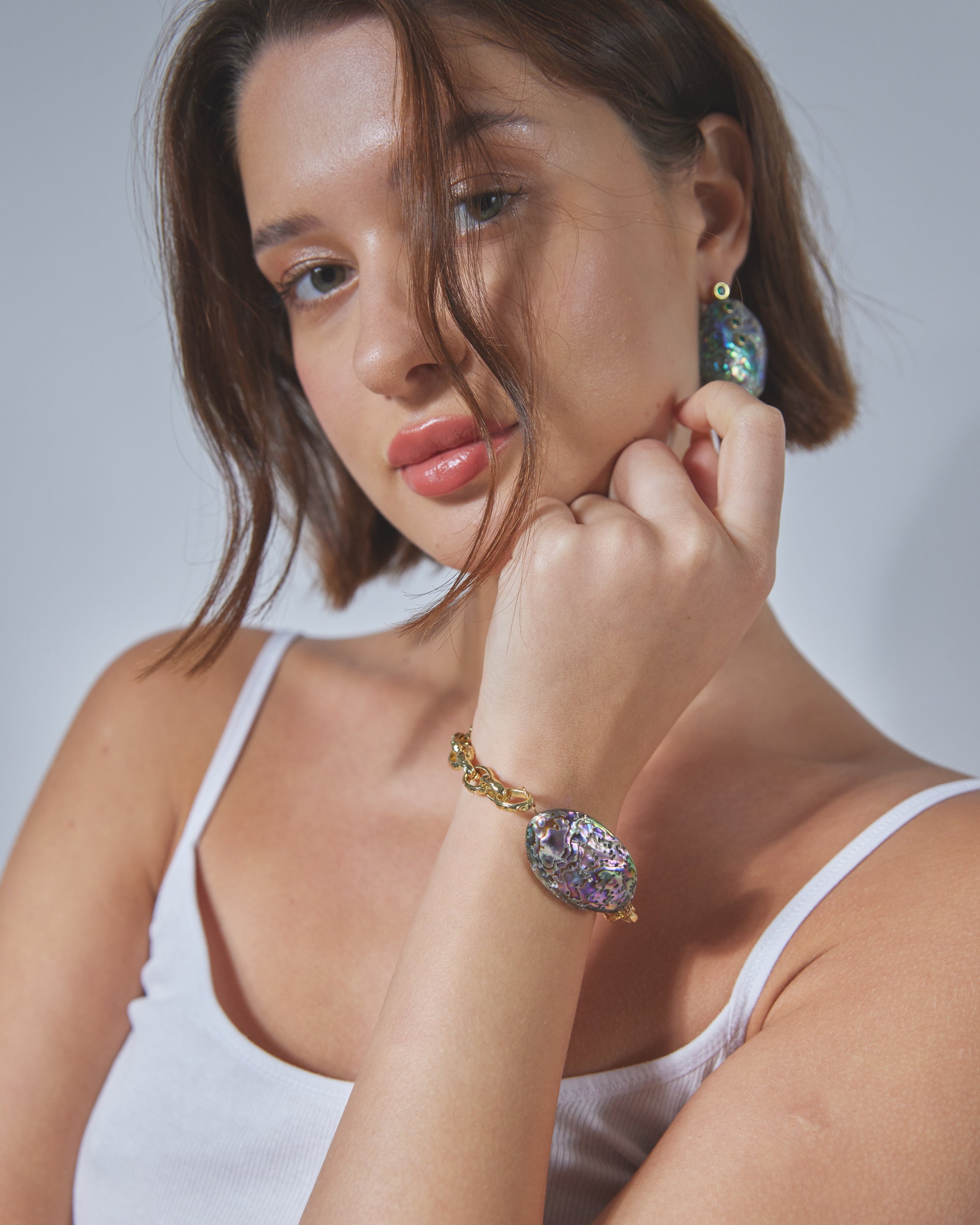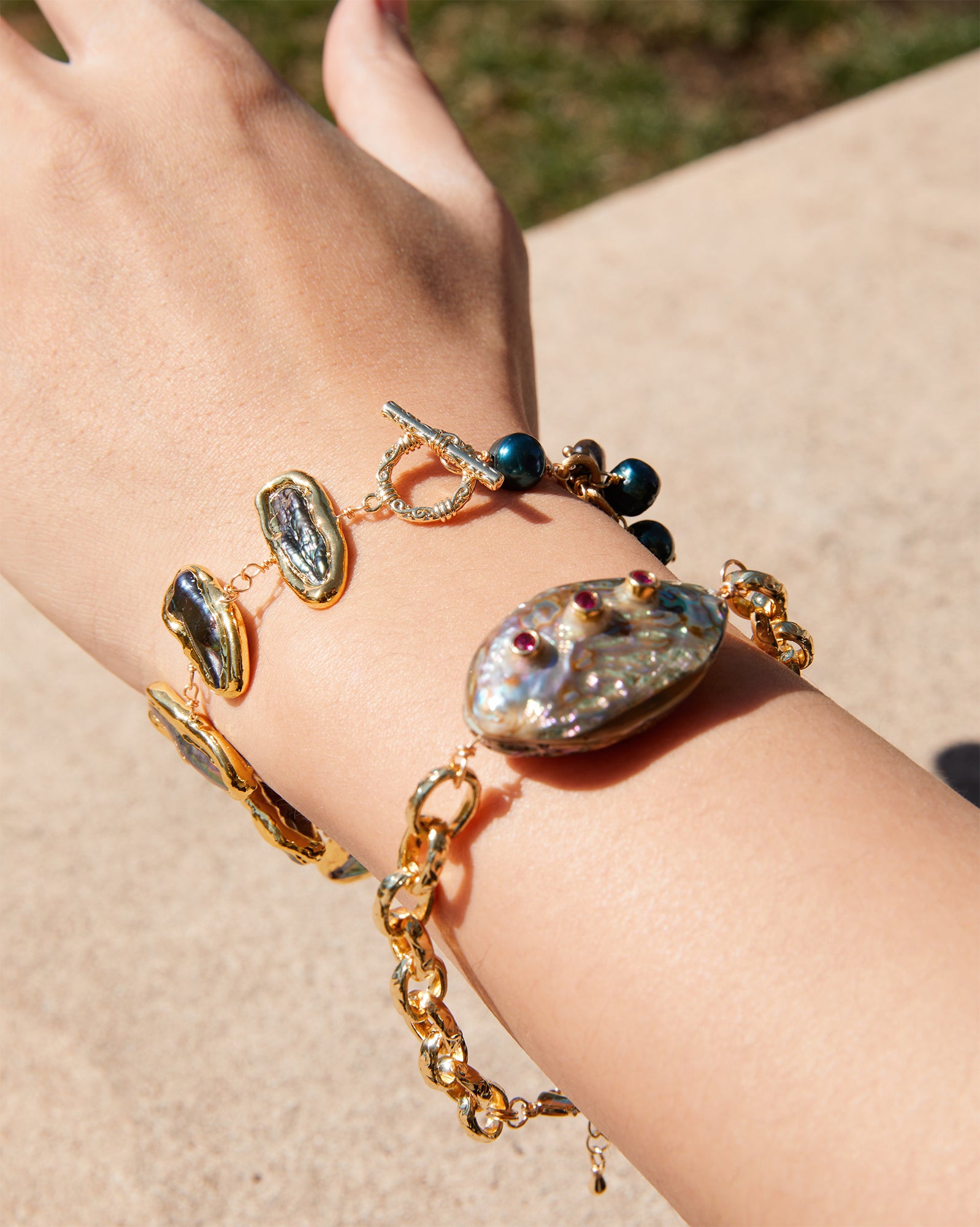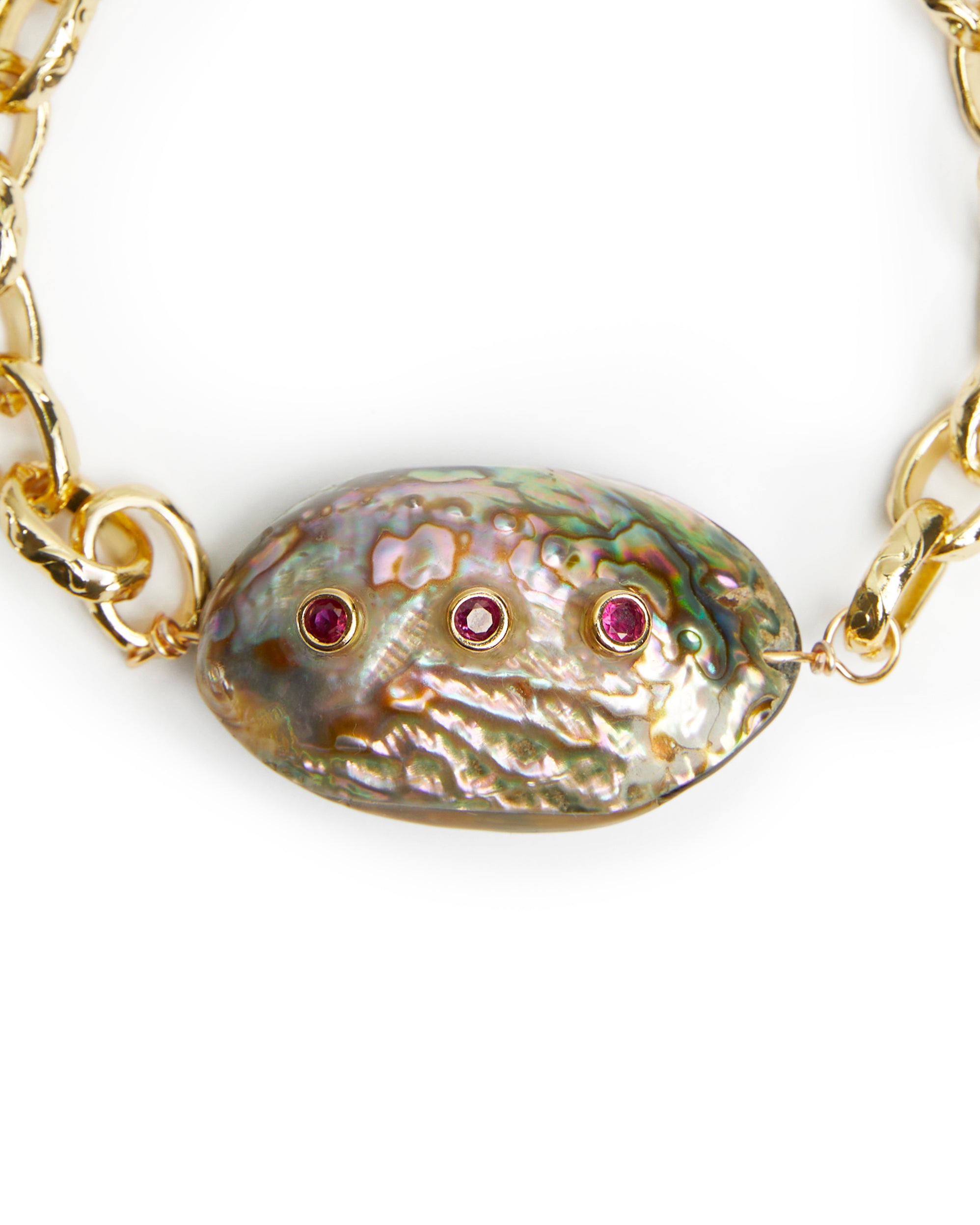 - Gems Info: natural abalone shell, fuchsia cz gem, gold plated link chain