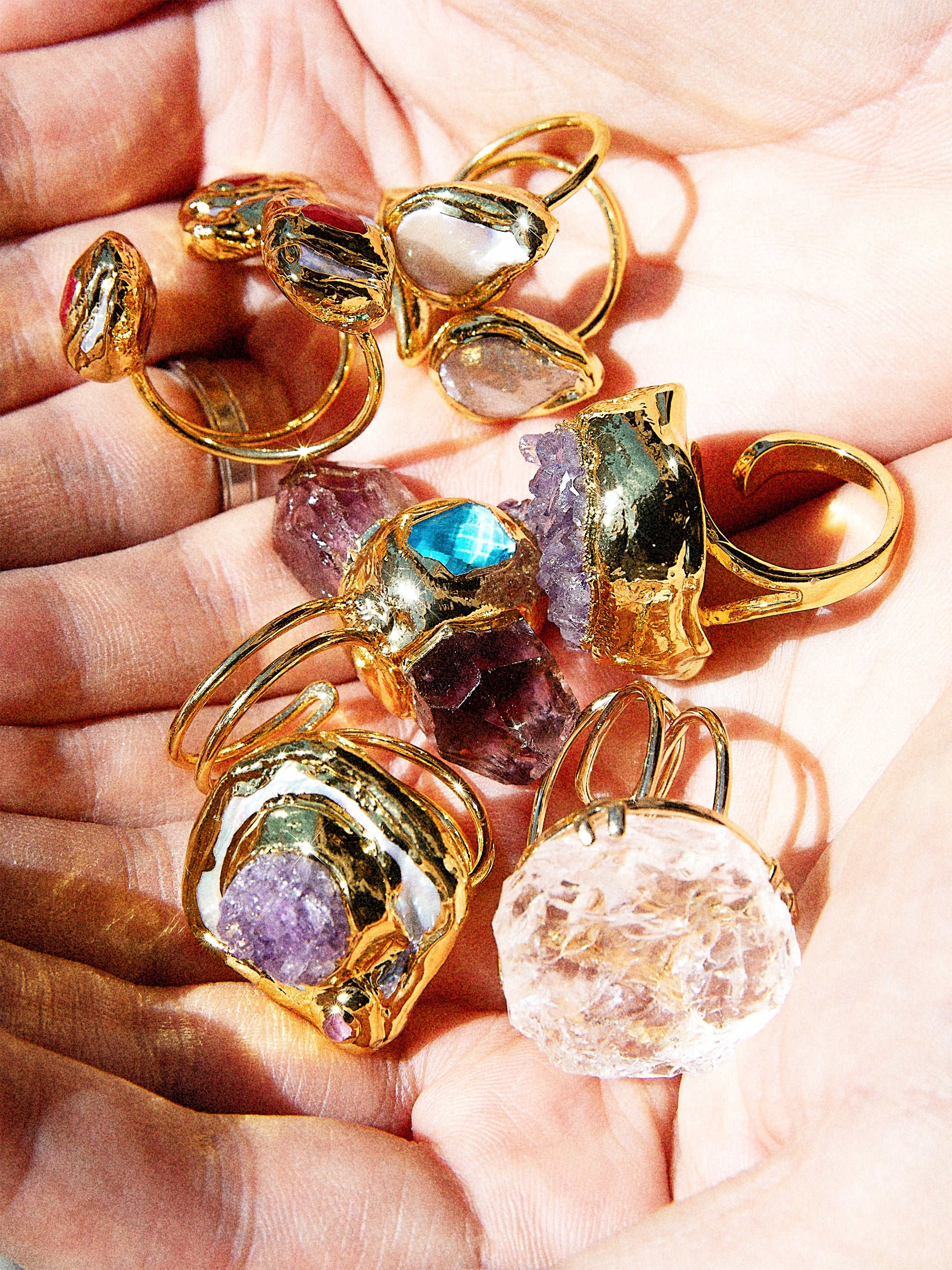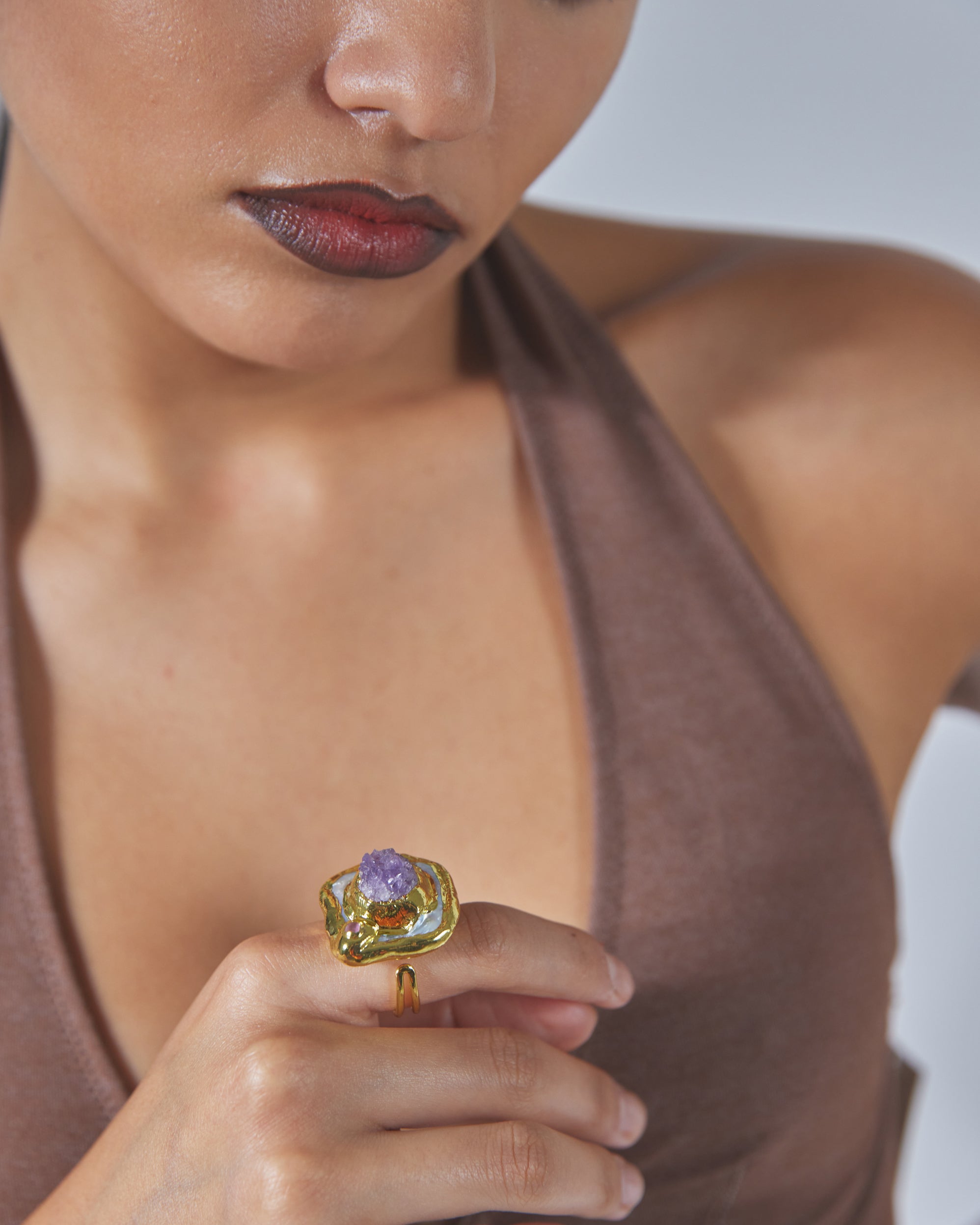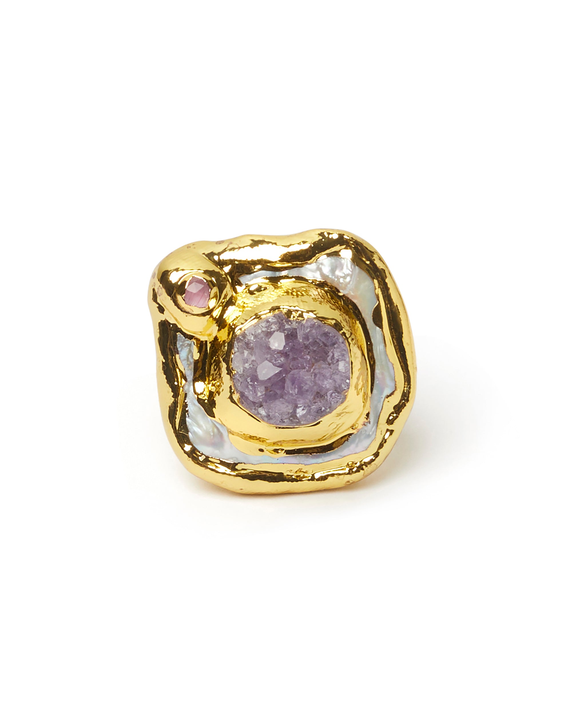 Volcano-001, handcrafted 18k gold plated ring with natural pearl and natural purple stones.