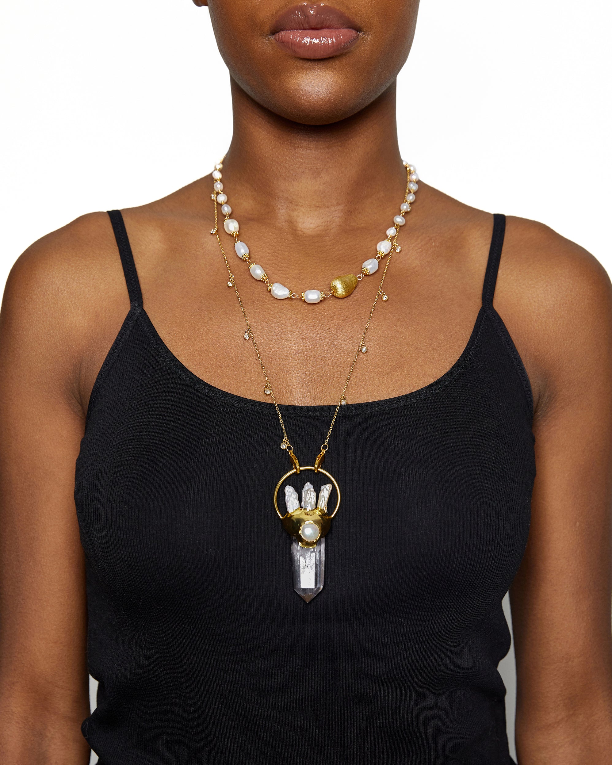Icicle, handcrafted gemstone necklace with natural pearls, 18K gold plated.