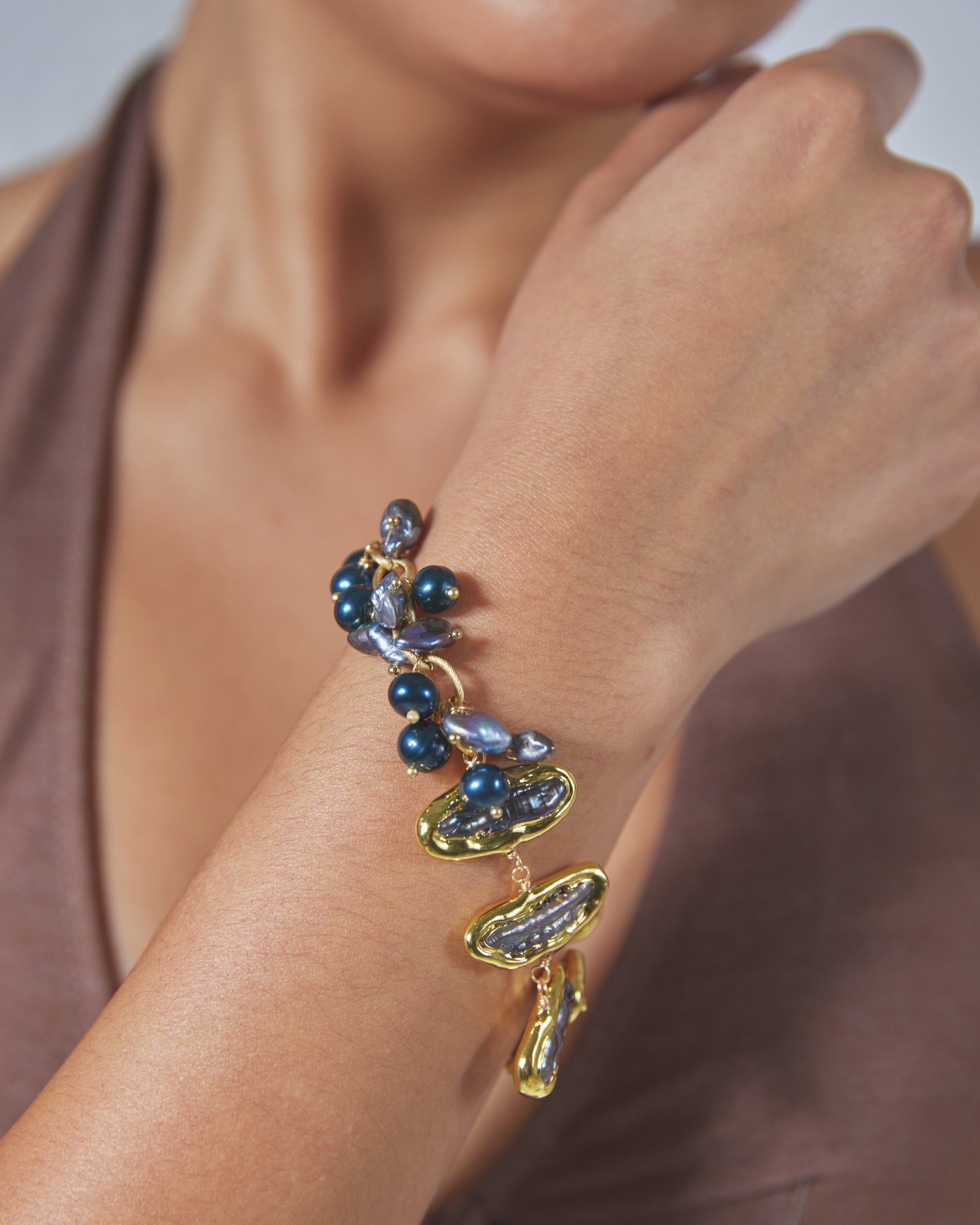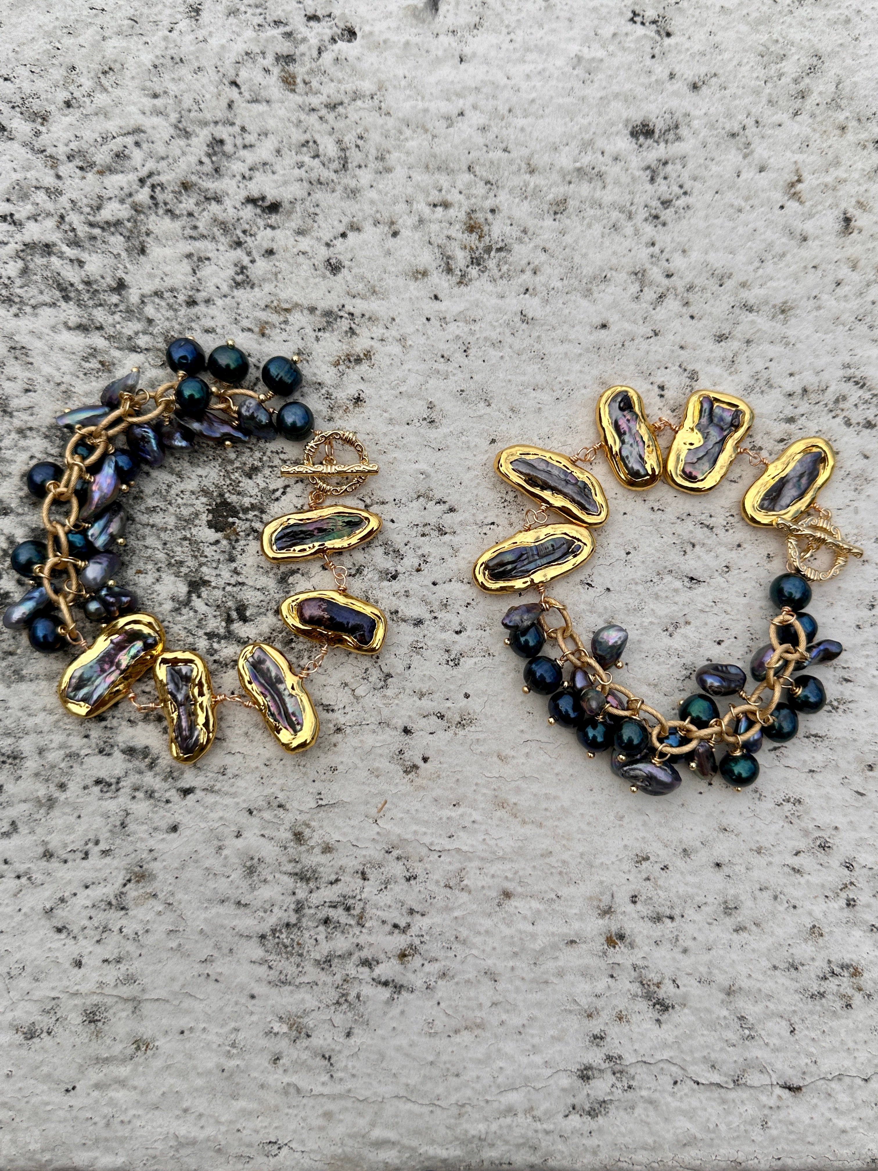 Pebbles, handmade black Biwa pearls bracelet. 18K gold plated.