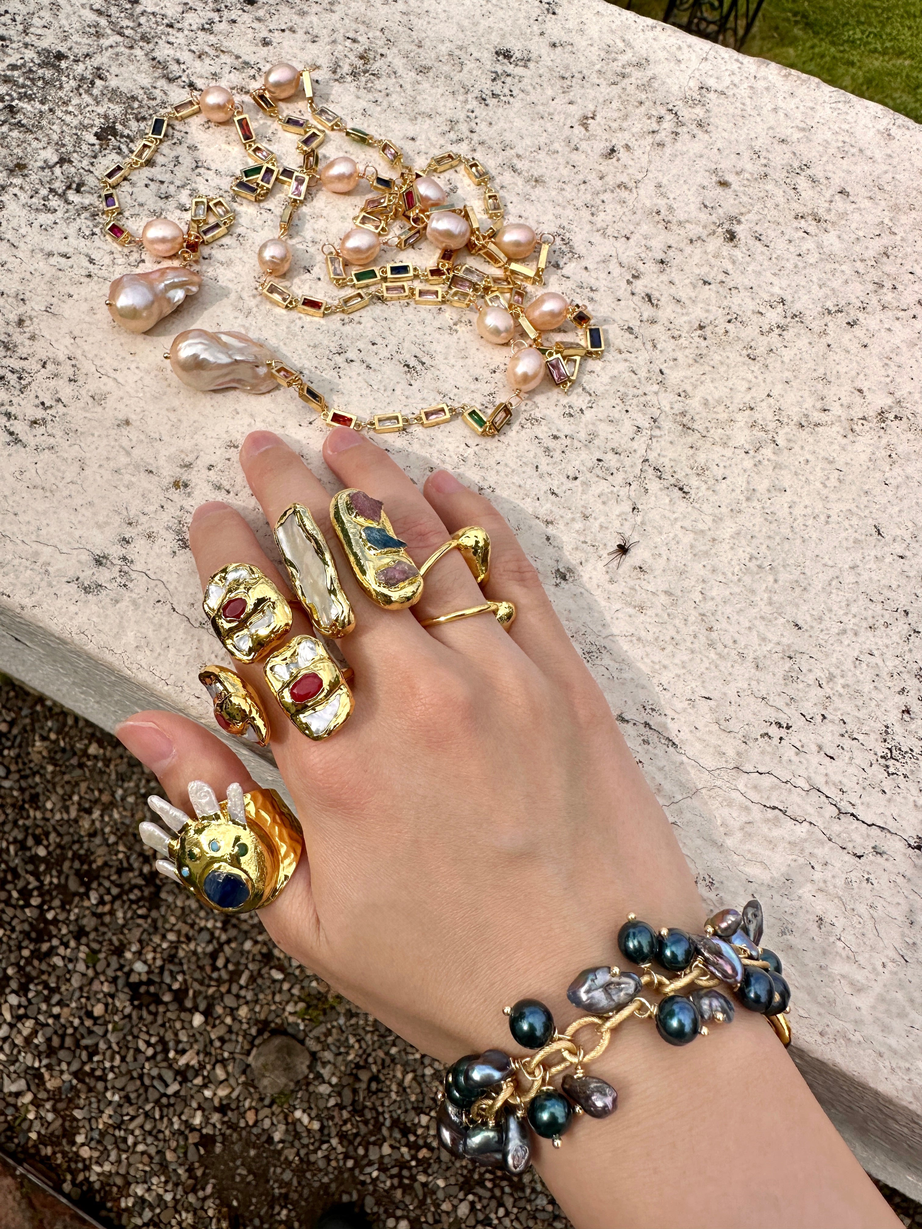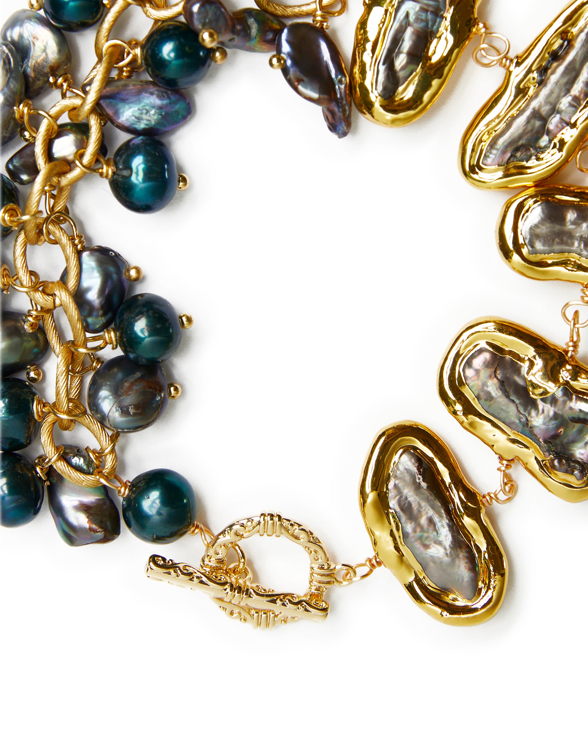 - Gems Info: Fresh water cultured pearl, black Biwa pearl with gold plated edge, black keshi pearl and potato pearl.